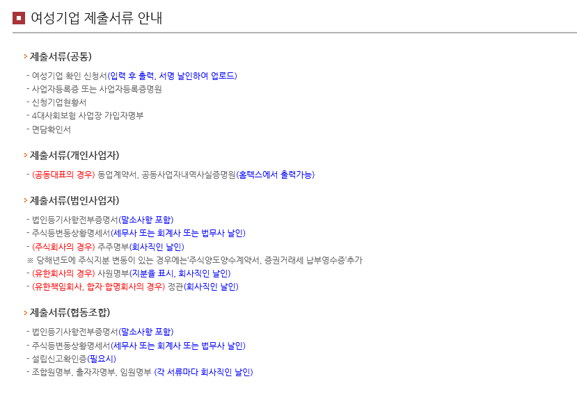 여성기업심사를 이곳에서 신청할 수 있습니다. 준비하실 서류는 다음과 같습니다.